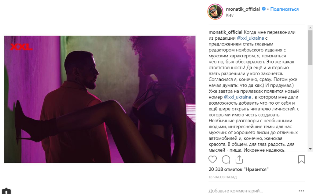 Український співак Дмитро Монатік став головним редактором листопадового номера чоловічого журналу “XXL ukraine”.