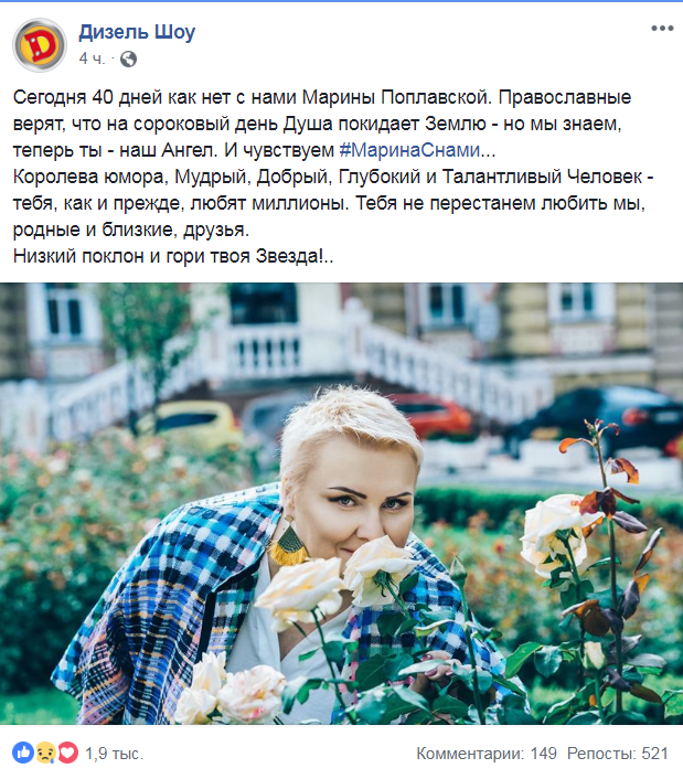 Колеги Марини на офіційній сторінці студії у Facebook залишили зворушливий пост. “Сьогодні 40 днів, як немає із нами Марини Поплавської. Православні вірять, що на сороковий день Душа покидає Землю — але ми знаємо, тепер ти — наш Янгол. І відчуваємо #МаринаЗнами”, — підписали публікацію.