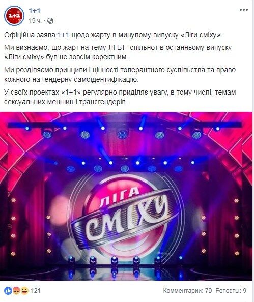 “Ми визнаємо, що жарт на тему ЛГБТ-спільнот в останньому випуску “Ліги сміху” був не зовсім коректним. Ми поділяємо принципи і цінності толерантного суспільства та право кожного на гендерну самоідентифікацію”, — пише телеканал.