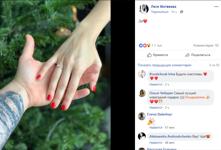 Про заручини зірка повідомила на своїй сторінці у Facebook, опублікувавши фото з обручкою на безіменному пальці.