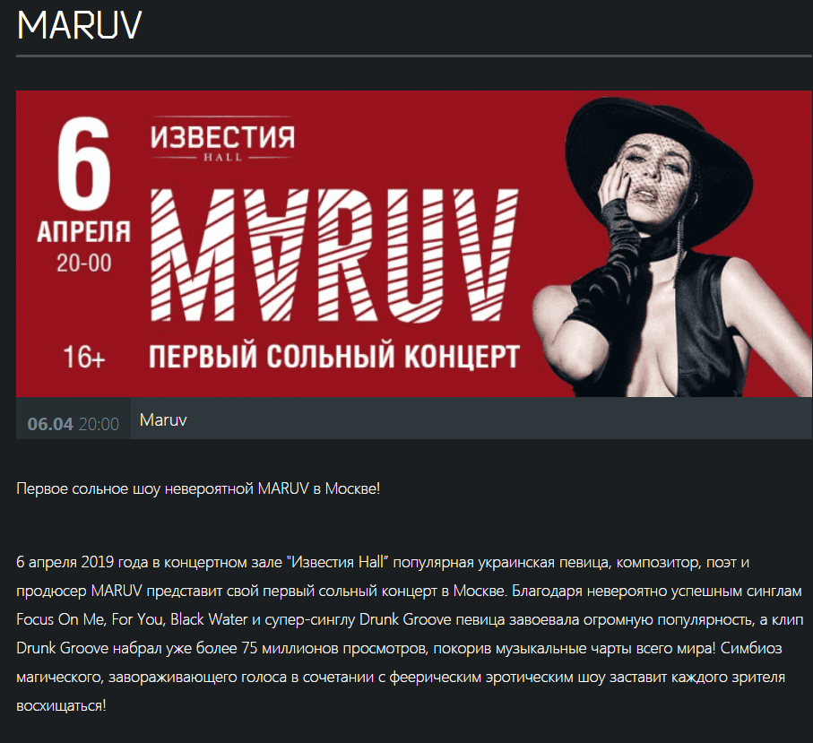 Як розповіли організатори концертів, з питаннями про скасування заходів до них поки ніхто не звертався. OBOZREVATEL також вирішив перевірити інформацію – на сайтах клубів, де виступатиме МARUV, дійсно досі розміщені афіші та йде продаж квитків.